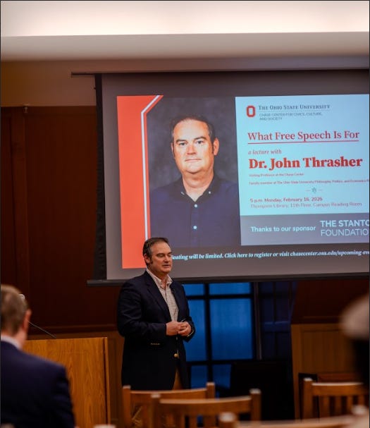 Professor Thrasher’s talk explored the philosophical foundations of free speech, the cost societies bear to protect dissent, and the importance of maintaining civil discourse even when disagreements run deep.